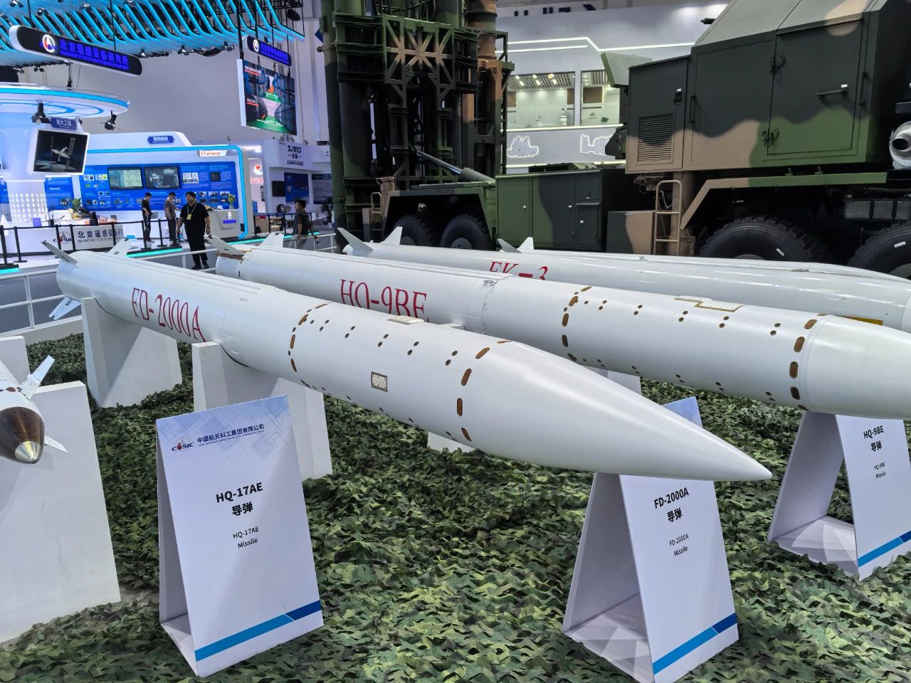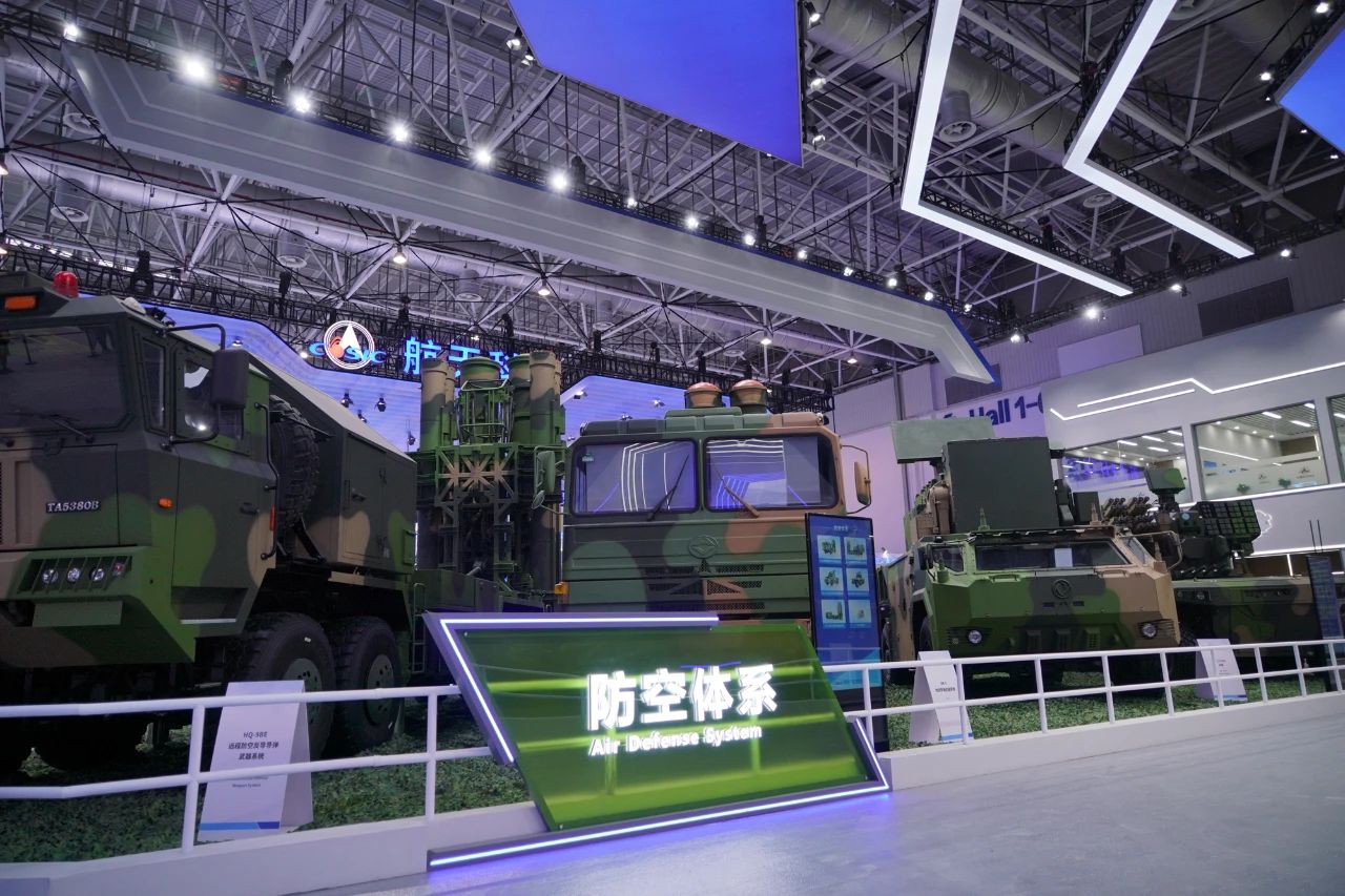 在中國航天科工集團有限公司防空體系展區,HQ-9BE遠程防空武器系統、FD-2000A中遠程防空武器系統、FK-3中遠程防空武器系統、HQ-17AE近程防空武器系統等“明星裝備”煥新亮相。