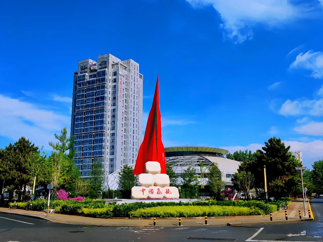 雨后初霽,碧空如洗。在三院辦公樓前廣場東南側,“中國飛航·超越”雕塑巍然聳立,形如未來飛行器,在厚重的石基之上蓄勢待發(fā)、昂首蒼穹。