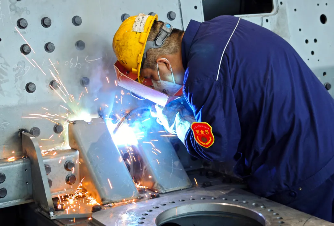 入夏以來,氣溫不斷攀升。長征公司金工車間現場,電焊工們穿著厚厚的防護服,手握焊槍搶抓工時,在光與熱的持續作用下“蒸”戰高溫。重任在肩,電焊工們直面“烤”驗,全神貫注緊盯焊接點,防止焊接變形量,嚴守施工質量關。(圖文/李玲)