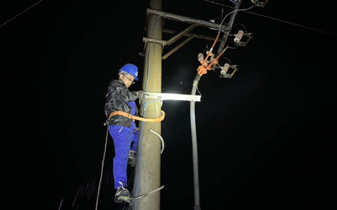 保障組人員腳蹬爬桿器,一步一步爬上橫擔,固定好安全繩,經過多點巡查,他們迅速定位故障,查明是因為受雷雨天氣影響,架空線路上的避雷器被擊穿導致線路單相接地。