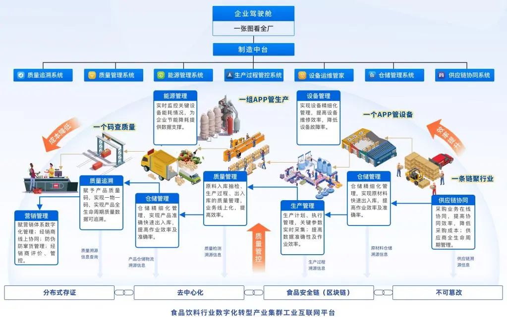 航天云網公司自主開發(fā)的“食品飲料行業(yè)數(shù)字化轉型(全域)解決方案”聚焦食品企業(yè)關注提升生產效率、降低運營成本、加強質量管控等需求,從產品鏈和價值鏈深度融合的角度出發(fā),提供數(shù)字化轉型全域解決方案,涵蓋產品全生命周期管理系統(tǒng)、銷售管理系統(tǒng)、供應鏈協(xié)同系統(tǒng)、生產過程管控系統(tǒng)、質量管理系統(tǒng)、質量溯源系統(tǒng)、設備運維管家、能源優(yōu)化系統(tǒng)、倉儲管理系統(tǒng)、成本分析系統(tǒng)等12款應用系統(tǒng)產品集。目前,該方案已賦能廣東、貴州、甘肅等多個省市數(shù)十家企業(yè)實現(xiàn)數(shù)字化轉型,助力制糖、飲用水、食品添加劑、飲料、啤酒等細分行業(yè)企業(yè)實現(xiàn)提質降本增效。