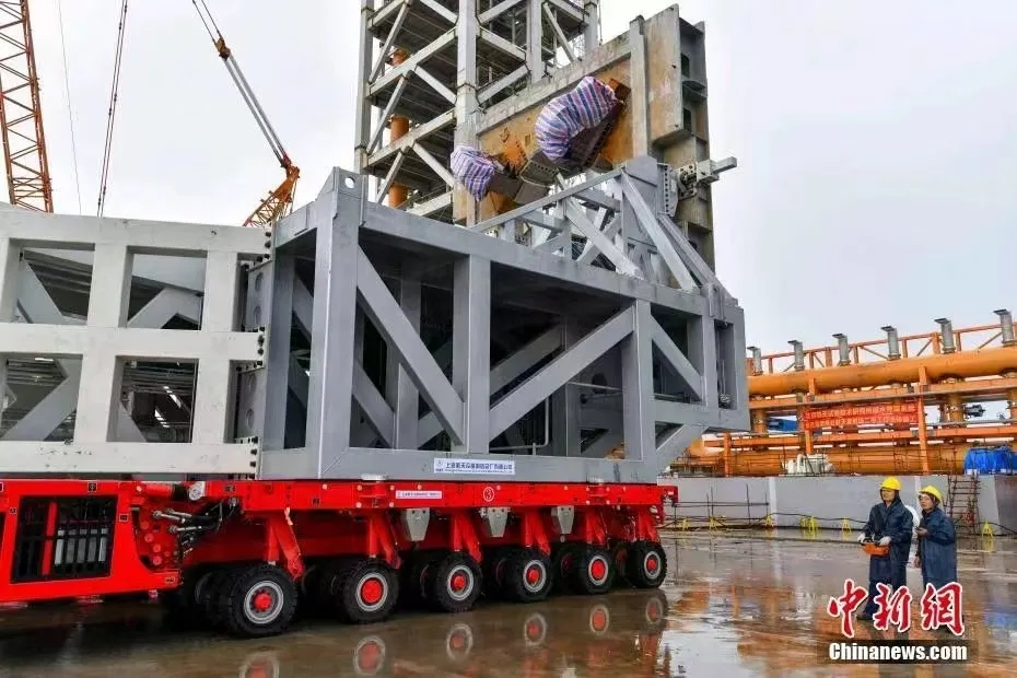 長征十二號(hào)火箭是我國首型4米級(jí)運(yùn)載火箭,全長約62米,起飛質(zhì)量約430噸。配套的起豎系統(tǒng)高70米、重240噸。該型火箭為商業(yè)航天而生,屬于“大高個(gè)”、大直徑、大推力,實(shí)現(xiàn)了火箭運(yùn)載能力的大幅提升。在運(yùn)輸過程中,三輛自行式模塊運(yùn)輸車呈“品”字形結(jié)構(gòu)擺放,分別位于起豎系統(tǒng)的下方,穩(wěn)穩(wěn)地托舉住火箭及起豎系統(tǒng),實(shí)現(xiàn)全箭水平轉(zhuǎn)運(yùn)。