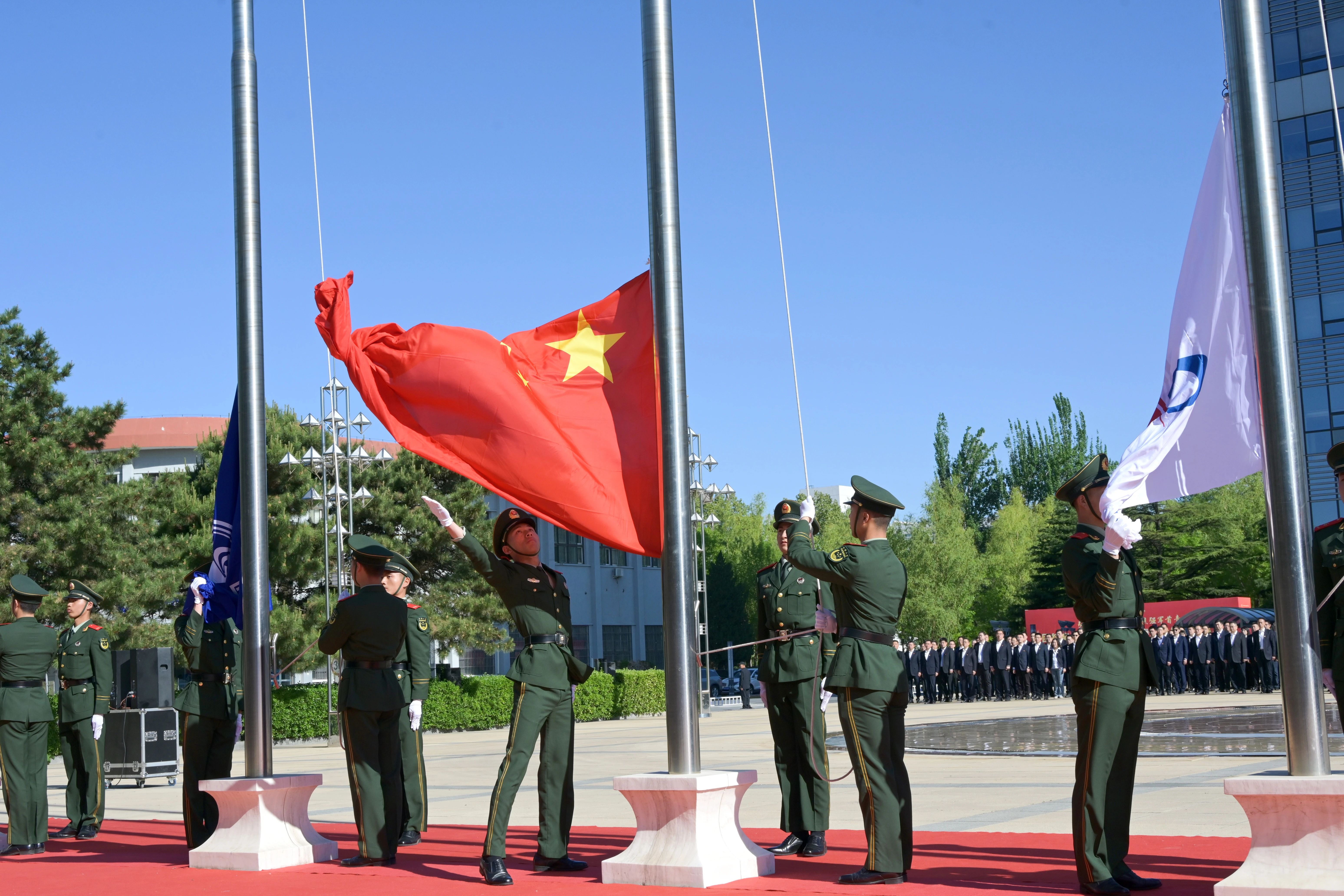 8點30分,國旗護衛隊邁著鏗鏘有力的步伐,護送鮮艷的五星紅旗,昂首闊步走向升旗臺。伴隨著雄壯的國歌和航天科工之歌,國旗、集團公司司旗和三院院旗冉冉升起,在場干部職工莊嚴肅立,行注目禮。