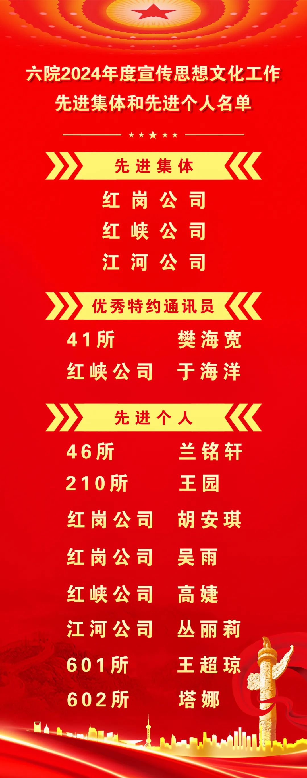 會上,觀看了六院宣傳思想文化工作會專題片,通報了兩年來全院宣傳思想文化系統獲得的集團公司級及以上榮譽,表彰了六院2024年度宣傳思想文化工作先進集體、先進個人。先進集體和先進個人代表作了現場交流。
