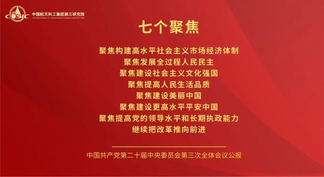 黨的二十屆三中全會,是在以中國式現代化全面推進強國建設、民族復興偉業的關鍵時期召開的一次十分重要的會議。航天三院黨委將學習好宣傳好貫徹好黨的二十屆三中全會精神作為當前和今后一個時期的一項重大政治任務,高度重視,迅速行動,引導三院全體黨員干部職工把思想和行動統一到全會精神上來,把智慧和力量凝聚到落實全會精神和部署上來,聚焦主責主業,履行強軍首責,持續推動飛航事業高質量發展。