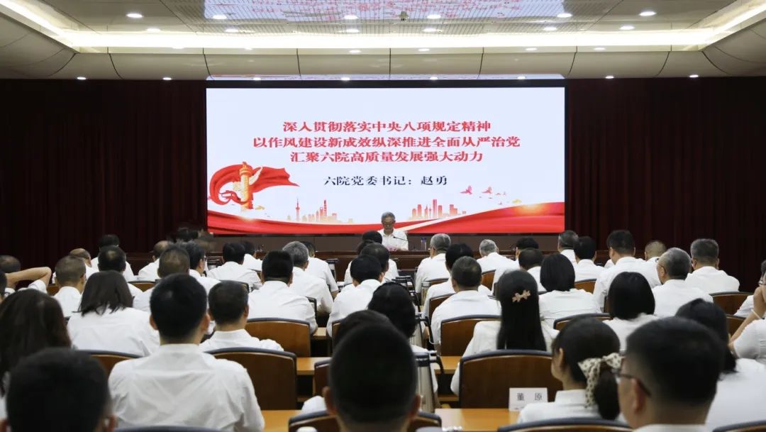 趙勇以《深入貫徹落實中央八項規定精神 以作風建設新成效縱深推進全面從嚴治黨 匯聚六院高質量發展強大動力》為題,與黨員干部職工共同再學習再領會習近平總書記關于黨的作風建設的重要論述,深刻把握黨的十八大以來貫徹落實中央八項規定精神的成效和經驗,將學習教育的成果轉化為推動工作的強大動力。