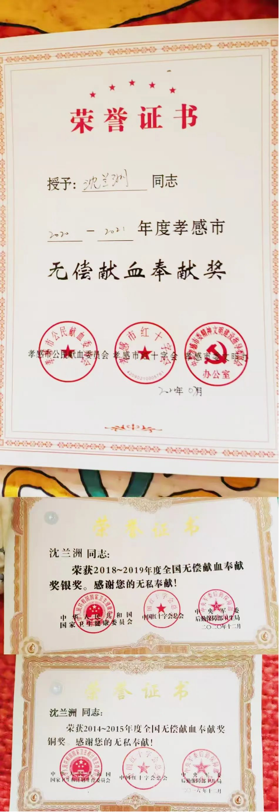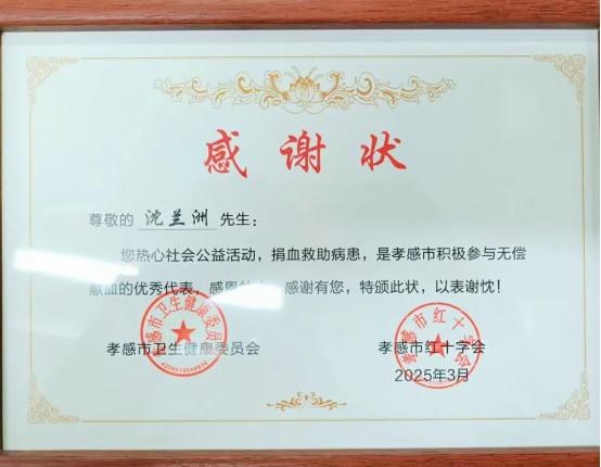沈蘭洲獲“孝感市無償獻血優秀個人(全血)”榮譽稱號