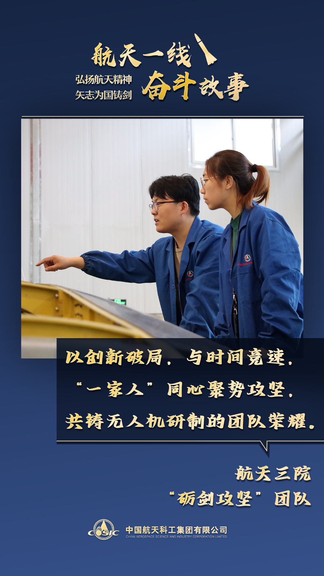 跑道上的引擎轟鳴,是航天人向藍(lán)天遞交的答卷。為了這一天,團(tuán)隊(duì)鏖戰(zhàn)三載,在無(wú)人涉足的技術(shù)盲區(qū)里闖路。何工從日常生活中捕捉靈感,以創(chuàng)新設(shè)計(jì)攻克機(jī)翼難題;飛測(cè)組頂著壓力與時(shí)間賽跑,三天完成八日任務(wù);熱試車遇阻時(shí),“一家人”跨團(tuán)隊(duì)打破壁壘聯(lián)手攻關(guān)。航天精神從不是口號(hào),是扎根每個(gè)細(xì)節(jié)的堅(jiān)守;也是融入點(diǎn)滴付出的擔(dān)當(dāng)。三院無(wú)人機(jī)團(tuán)隊(duì)初心如磐,步履不停,讓無(wú)人機(jī)的轟鳴聲成為建設(shè)世界一流航天防務(wù)企業(yè)的奮進(jìn)強(qiáng)音。(文/程凱強(qiáng)、李政昊 海報(bào)/張彤、杜宜桓)