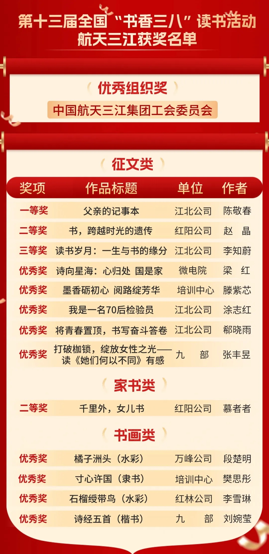 11月16日,全國(guó)第十三屆“書香三八”讀書活動(dòng)獲獎(jiǎng)名單揭曉,航天科工九院工會(huì)榮獲“優(yōu)秀組織獎(jiǎng)”,所屬7家單位13名個(gè)人作品獲獎(jiǎng)。