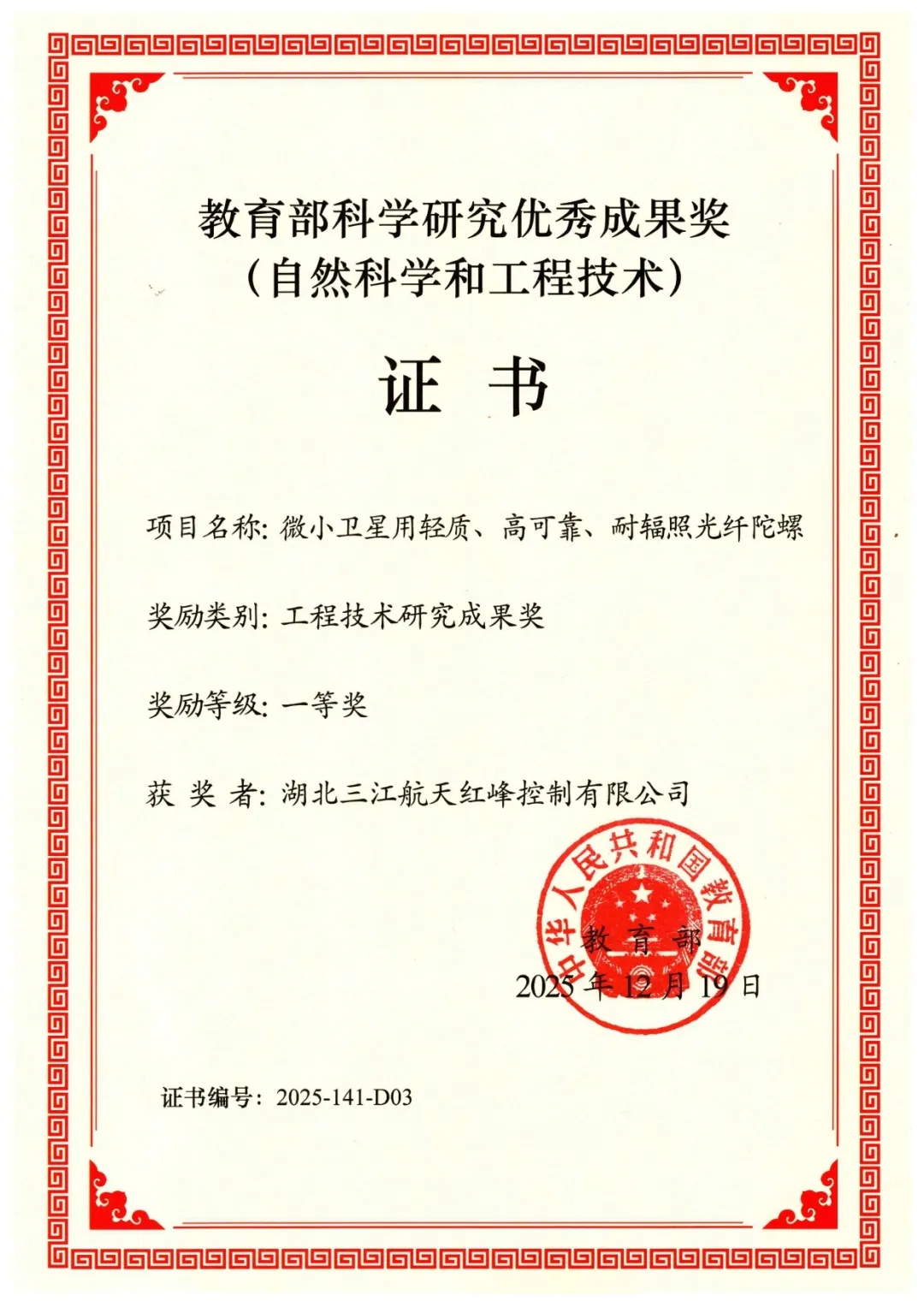 近日,航天科工九院紅峰公司申報的“微小衛(wèi)星用輕質(zhì)、高可靠、耐輻照光纖陀螺”項目榮獲2025年度教育部科學(xué)研究優(yōu)秀成果獎一等獎。